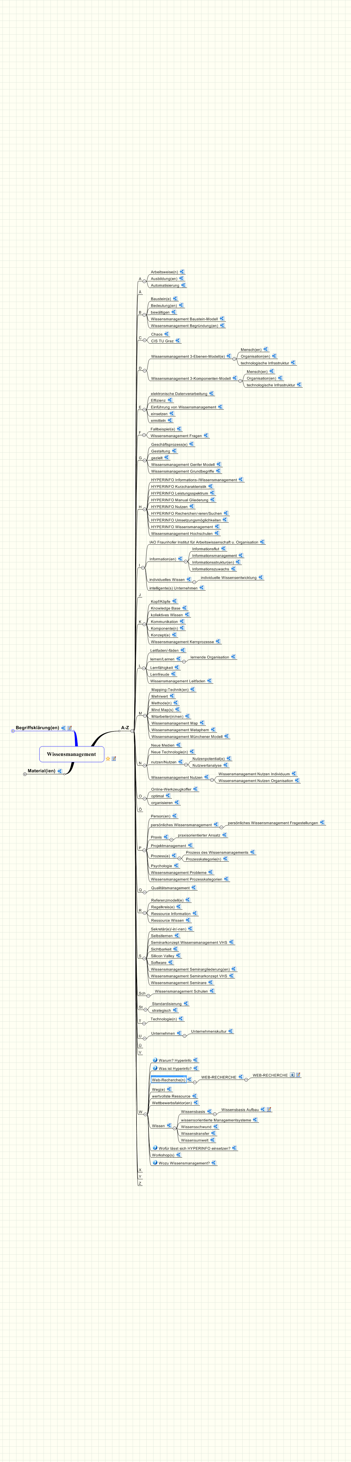 Bei zusammengesetzten Begriffen, die am linken oberen Ast ("Begriffsklärung(en)" > "Begriffswurzel(n)") in trunkierter (aufgespaltener) Form angefügt sind (z.B. "Wissensmanagement" ist aufgeteilt in " Wissens-" und "-management"), entwickelt sich mit der Zeit u.U. eine umfangreiche Sammlung von Übersichten.